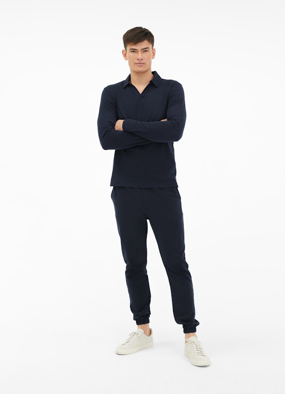 Mit klassischem Polokragen und kurzem V-Ausschnitt überzeugt das Longsleeve als stilvolles Loungewear-Piece. Dezente Seitenschlitze am Saum ergänzen den Look. Für Comfiness sorgt die dicht strukturierte Qualität aus purer Baumwolle.