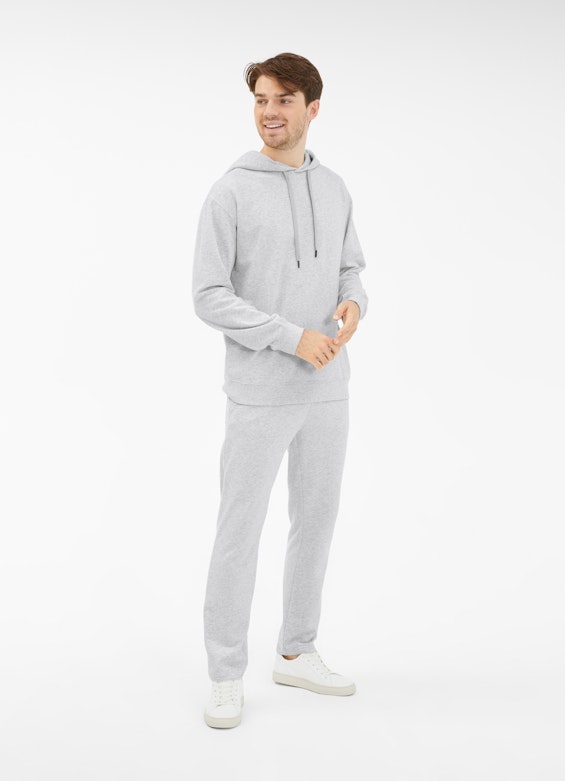 The soft cotton mix and the fleece lining give this hoodie in silver grey melange a comfy flair. Its hood and the cord with metal ends highlight the look. The dropped shoulder fit and ribbed cuffs complete the design of the piece.