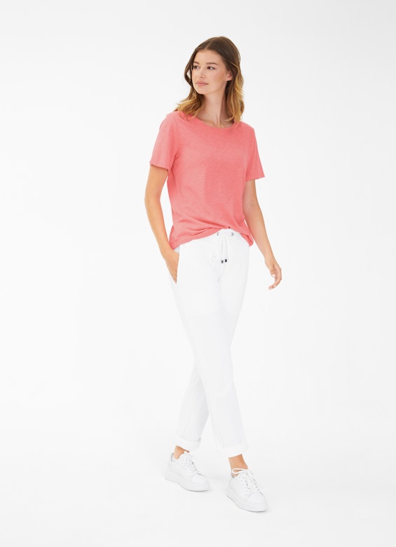 This T-shirt in a salmon shade convinces as a versatile eye-catcher. The feminine crew neck, short sleeves, and hems with double stitching distinguish the all-rounder's design.