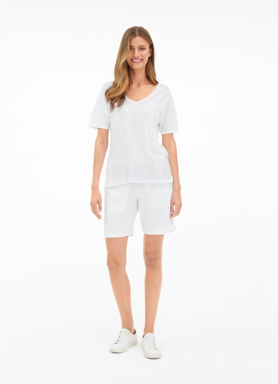Confectionné dans un mélange de coton et de viscose, ce t-shirt blanc séduit par sa matière texturée très chic, facile à superposer, qui va avec tous les looks. L’encolure en V féminine, les épaules tombantes et les fentes d’aisance latérales à la base agrémentent le modèle.
