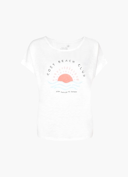 Als zeitloser Style-Favorit begeistert das weiße boxy T-Shirt mit kontrastivem „Cosy Beach Club“ Frontprint. Das Design im Baumwoll-Viskose-Mix erhält durch fixierte Ärmelbündchen und kurze Seitenschlitze lässiges Flair. Für ein klassisches Finish sorgt der Rundhalsausschnitt.