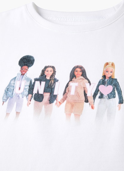 Das Barbie-Print-Motiv auf Vorder- und Rückseite mit „Unity Barbie“ Statement-Schriftzug zeichnet das weiße Sweatshirt als Key Piece aus. Der Baumwoll-Mix verwöhnt mit einer weichen Innenseite. Für ein stimmiges Finish sorgt das Design mit überschnittenen Schultern und einem modernen High-Low-Saum. Der komplette Erlös der JUVIA x Barbie-Kollektion wird an die „Deutsche Kinder- und Jugendstiftung“ und das Programm „Wir stärken Mädchen“ gespendet.