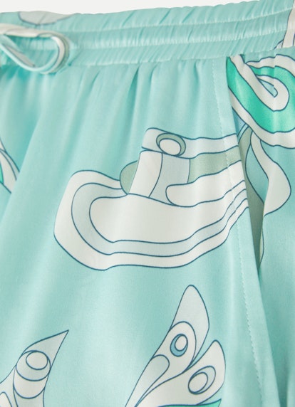 Cut in a wide and flowy silhouette, these trousers in aqua are stylish and made of premium silk satin. Their design features an elastic waistband and side pockets for a cozy twist. The modern "Retro Print" in the label's well-known fashion highlights the piece's look.