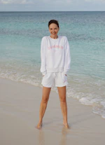 Summer, but make it cozy: These crisp white sweat shorts bring a relaxed, effortless feel to your look. The cuddly soft fleece ensures maximum comfort, while the relaxed cut gives the look an effortlessly modern feel. The "Summer Lovin'" print in delicate tea rose adds a playful, feminine touch and makes the shorts the perfect essential for warm days – whether at home, on the go, or at the beach.
