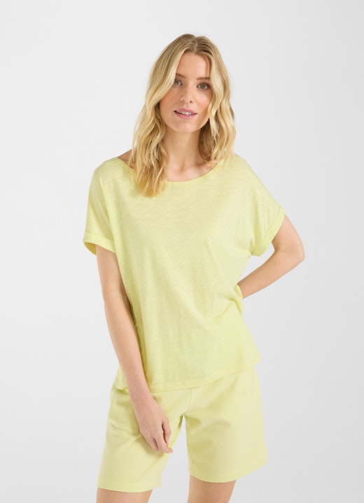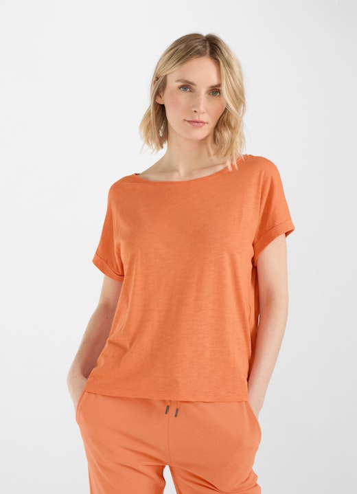 The flowing T-shirt fabric made of a natural cotton/viscose blend scores points across the board and lends itself well to wonderfully soft loungewear pieces. The remarkable thing about this fabric is its uneven woven texture: the unique slub yarn whose fibers are sometimes thin and sometimes thick creates an extraordinary effect of beautiful irregularity on the lightweight T-shirts, tops, and long-sleeved shirts.